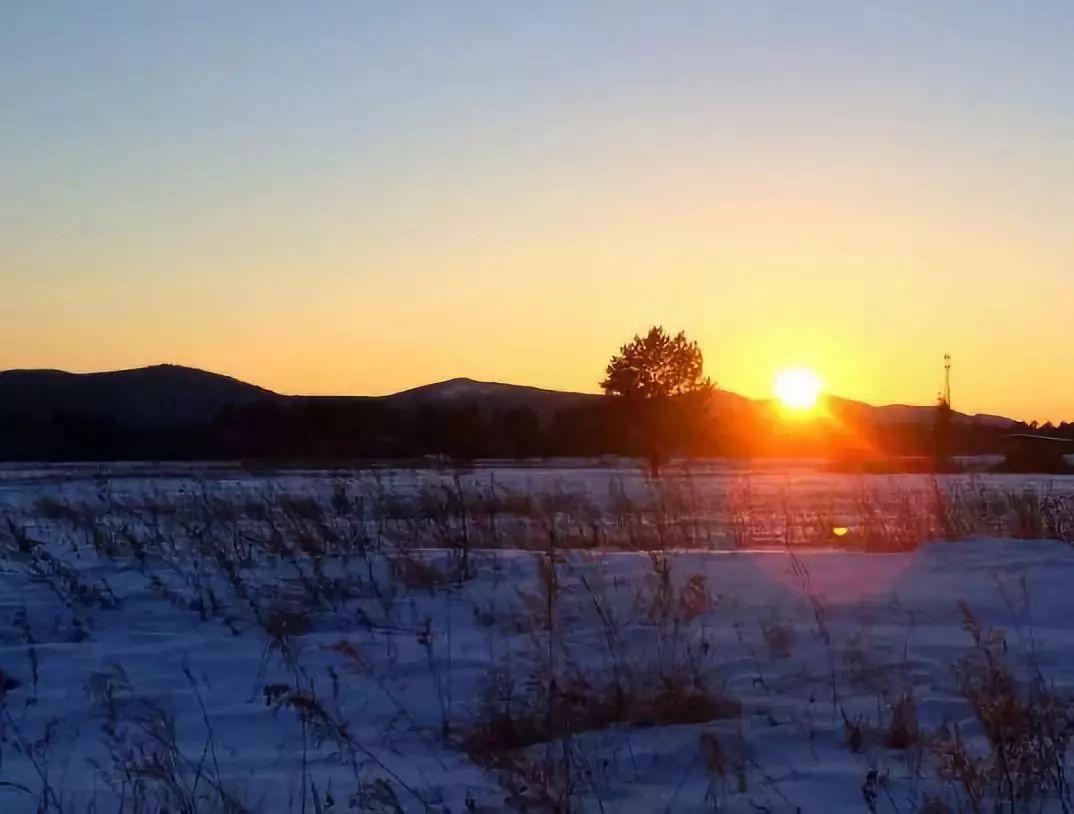 在寒冷冬天,太阳缓慢升起,直至把天空染成橘红色后,此时太阳就会下山,差不多2个小时。