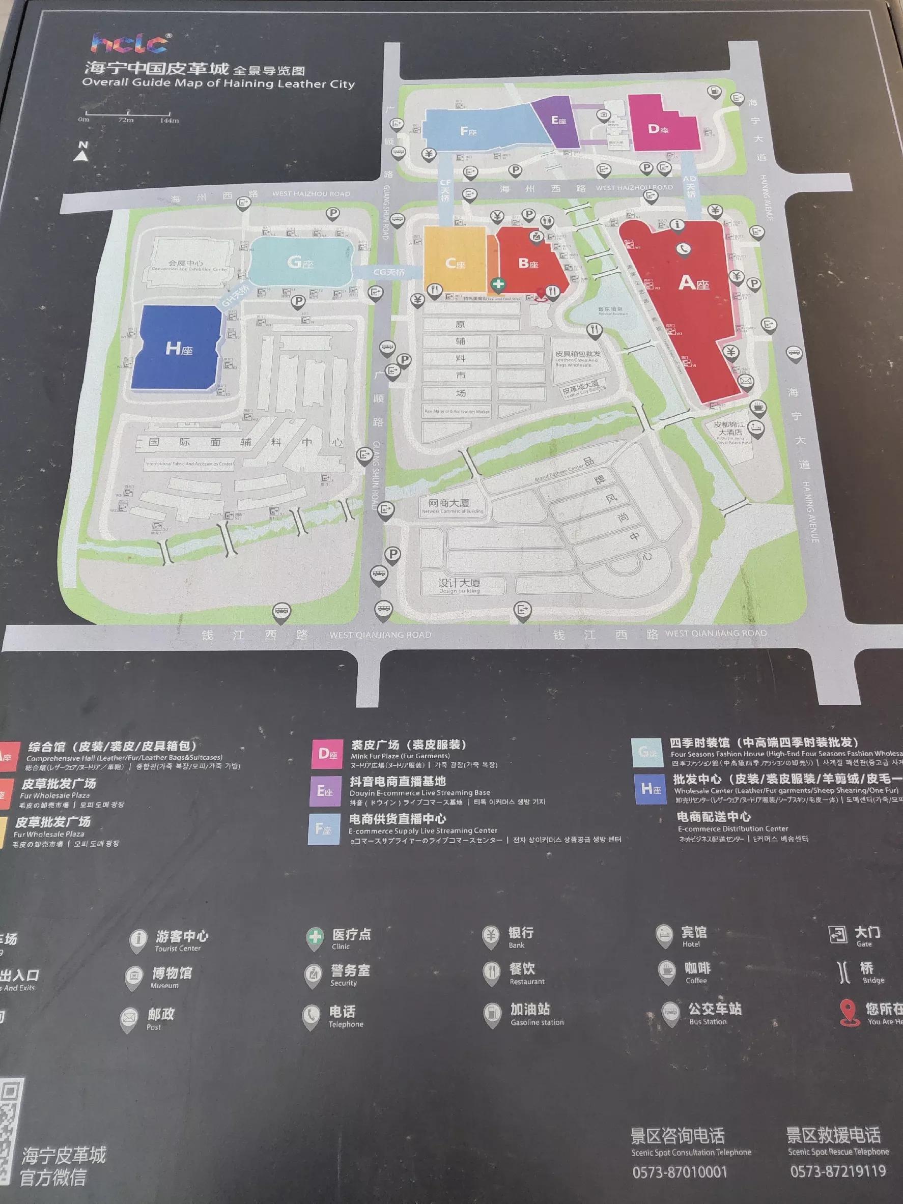 海宁皮革城非常大,总部市场及配套设施总建筑面积约100万平方米,设有A座(综合购物广场)、B座(皮装.鞋业广场)、C座(皮草广场)、D座(裘皮广场)、AD天桥(皮毛一体)、E座(女装馆)、F座(品牌旗舰店广场)、地产箱包馆(一、二楼皮具箱包零售,三楼批发)及原辅料市场,高峰时期日客流量10万人次,年交易额150亿元。
