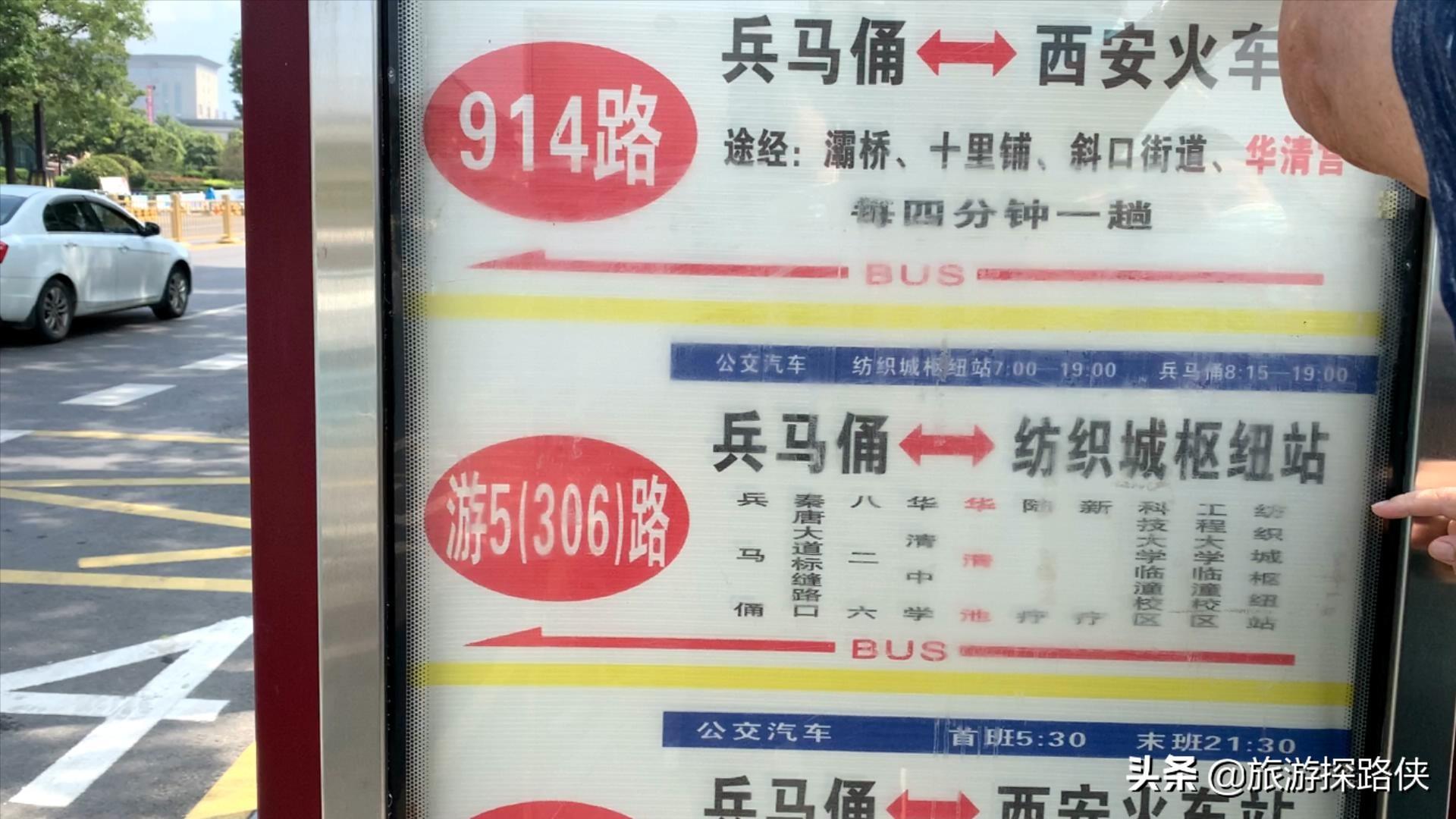 首先坐地铁2号线到北大街站转1号线,坐到纺织城站后转9号线,到华清池站从C口出来,站口不远处就有公交站,这里能去兵马俑的车比较多,我坐的是游5(306)路,终点就是兵马俑公交站,这里需要备好三块钱零钱,因为这趟车是专人售票,不能手机支付。到了终点下车后可能会有陌生人搭讪,以各种理由劝你跟她走,直接无视转身走开就行。