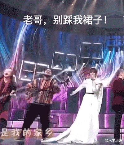 或许是一旁的小哥表演得太忘我,全程用脚踩着阿兰的裙子 。